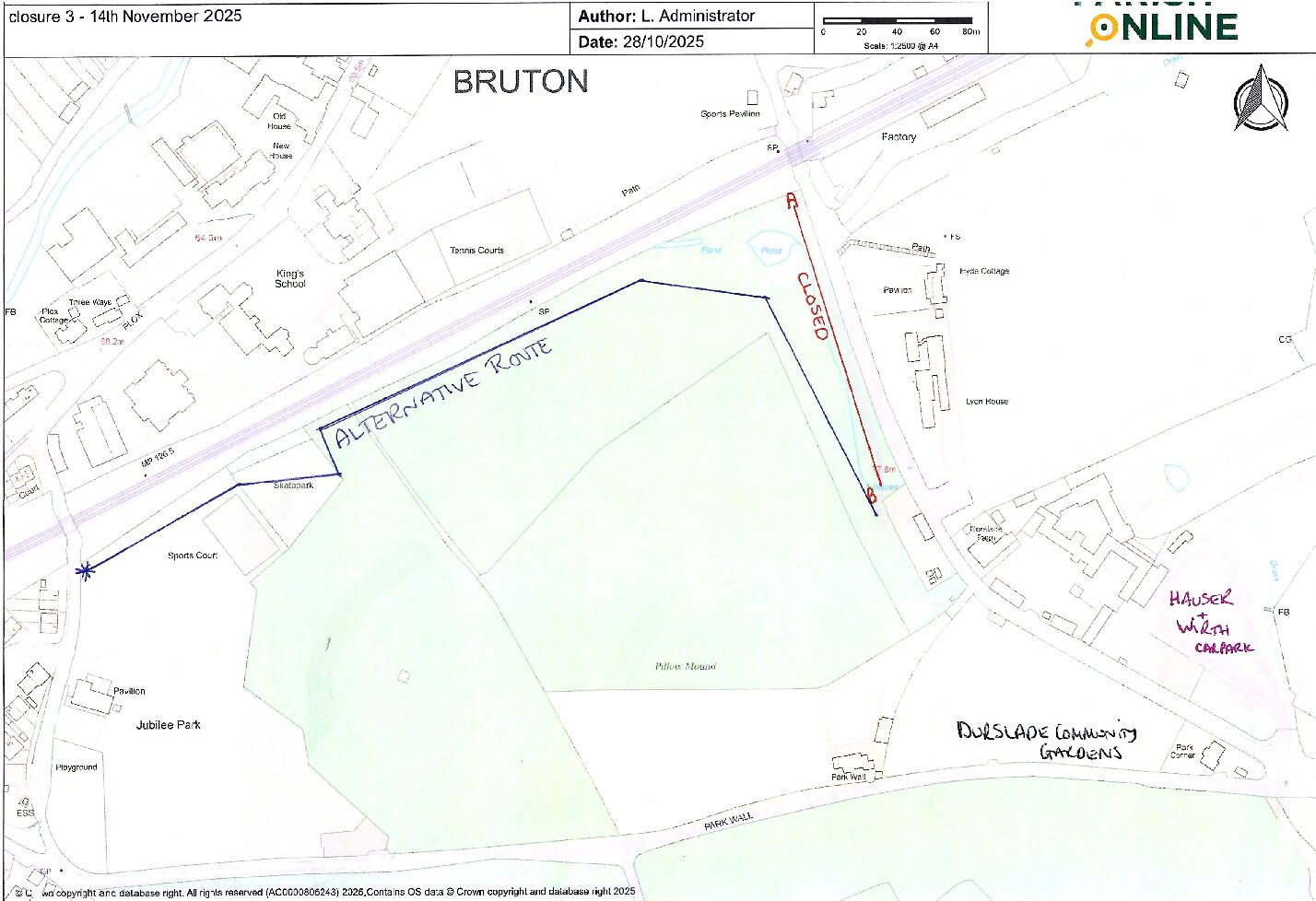 The footpath will be closed (in between points A and B on the map) from 3rd November until 14th November. During this time, you can still walk via the Jubilee Park and Dovecote path across into Abbey Ponds (marked ‘Alternative Route’ on the map) or drive and use Hauser and Wirth Somerset’s car park for access to the allotments and Wild Shed Sauna.